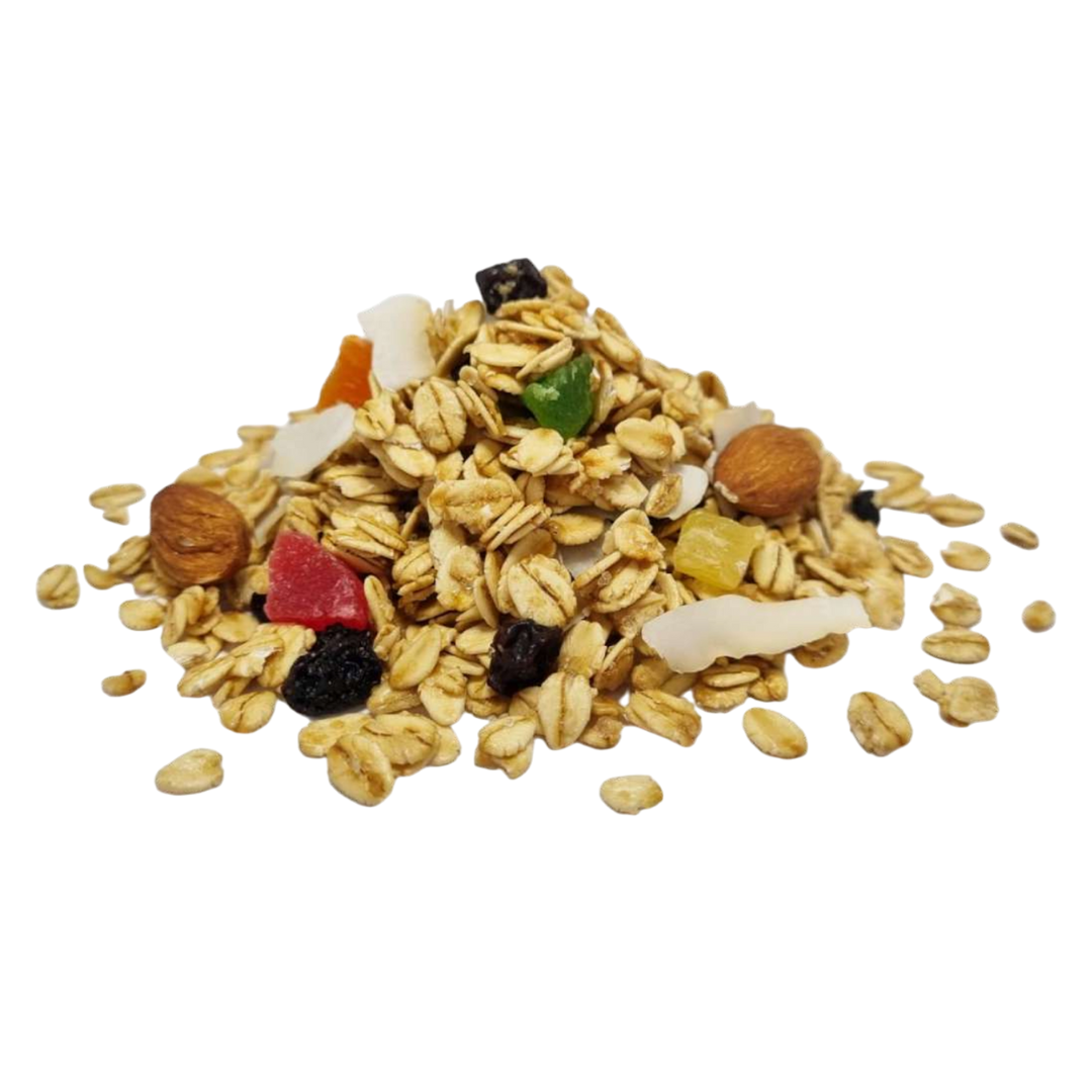 Mezcla crujiente de avena con miel, almendras, nuez partida, pasas negras, coco laminado y frutas deshidratadas (piña y fresa en cubos). Ideal para desayunos, colaciones, yogur y postres, con sabor dulce natural y excelente rendimiento para uso diario o comercial.